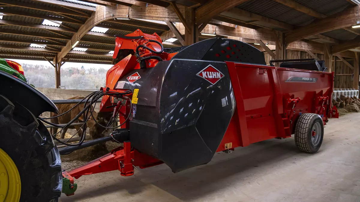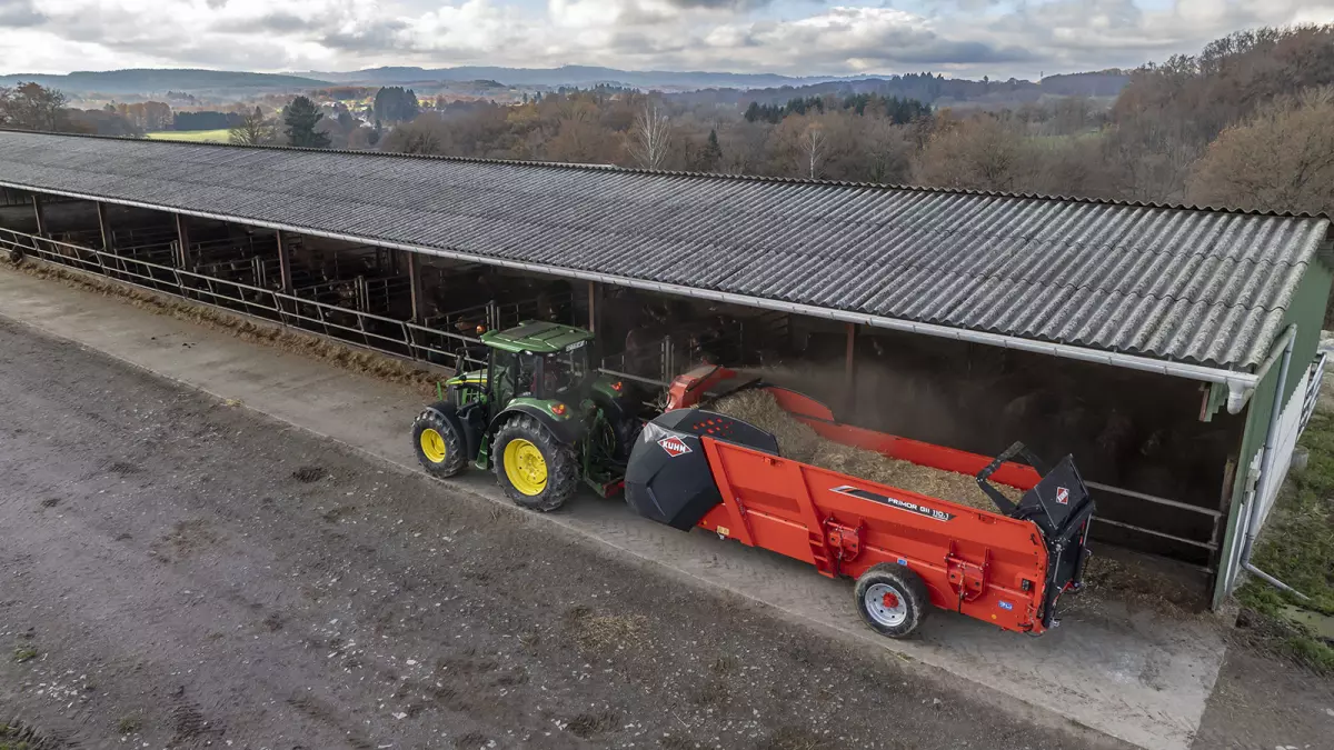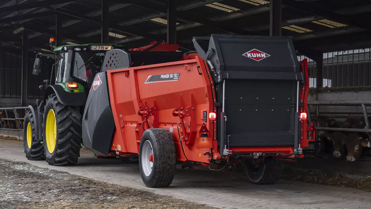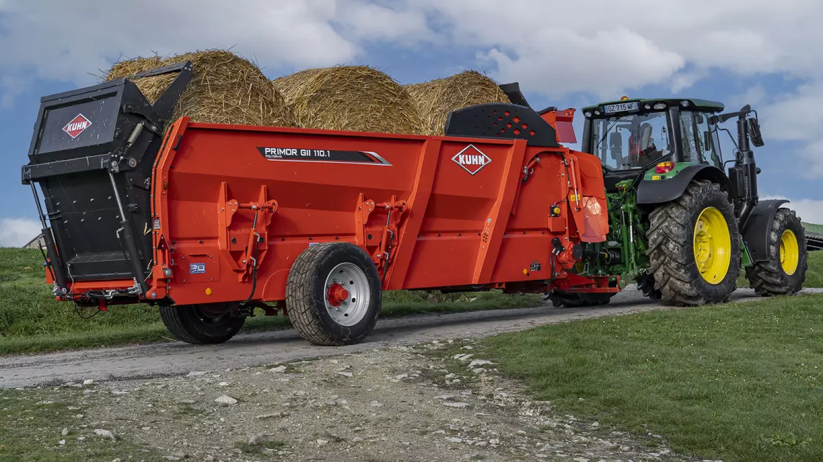 В категории соломораздатчиков объемом более 10 м3 модель PRIMOR GII 110.1 Polydrive была разработана с учетом требований эксклюзивных габаритов. Возможность разместить 2 кубических тюка размером 2,70 м при закрытом заднем борту, а также 4 круглых тюка размером 1,80 м: задача решена благодаря длине бункера за разматывателем 5,50 м. Эта длина соответствует точной ширине двух ковшей погрузчика, если ставить его рядом с машиной: поэтому она легко загружается силосом. Его высота 2,67 м обеспечивает пользователю лучший обзор во время работы в сравнении с машинами такого назначения на рынке, позволяя при этом проходить в самые низкие здания.
